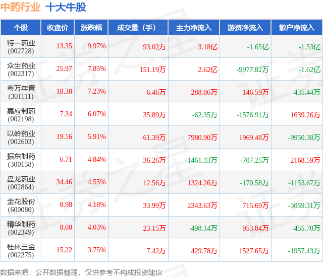 个股表现方面,中药行业当日领涨股为特一药业(002728),该股当日报收13.35,上涨9.97%,成交量93.02万,主力资金净流入3.18亿元。众生药业(002317)以上涨7.85%紧随其后,该股当日成交量151.19万,主力资金净流入2.62亿元。除此之外,粤万年青(301111)、嘉应制药(002198)、以岭药业(002603)均进入当日牛股之列。具体个股列表见下表: