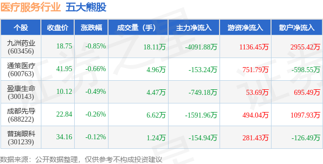 个股表现方面,医疗服务行业当日领跌股为九洲药业(603456),该股当日报收18.75,下跌0.85%,成交量18.11万,主力资金净流出4091.88万元。通策医疗(600763)以下跌0.66%紧随其后,该股当日成交量4.96万,主力资金净流出153.24万元。除此之外,盈康生命(300143)、成都先导(688222)、普瑞眼科(301239)均进入当日熊股之列。具体个股列表见下表: