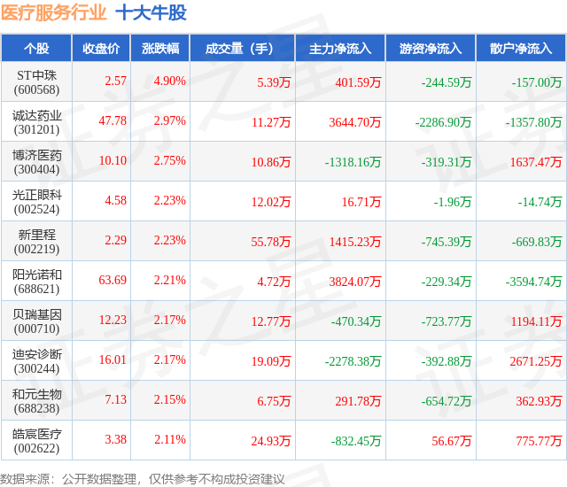 个股表现方面,医疗服务行业当日领涨股为ST中珠(600568),该股当日报收2.57,上涨4.9%,成交量5.39万,主力资金净流入401.59万元。诚达药业(301201)以上涨2.97%紧随其后,该股当日成交量11.27万,主力资金净流入3644.7万元。除此之外,博济医药(300404)、光正眼科(002524)、新里程(002219)均进入当日牛股之列。具体个股列表见下表: