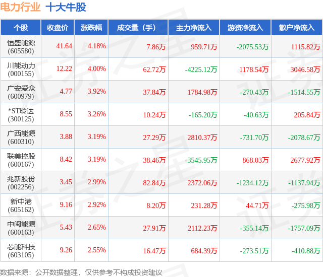 个股表现方面,电力行业当日领涨股为恒盛能源(605580),该股当日报收41.64,上涨4.18%,成交量7.86万,主力资金净流入959.71万元。川能动力(000155)以上涨4.0%紧随其后,该股当日成交量62.72万,主力资金净流出4225.12万元。除此之外,广安爱众(600979)、*ST聆达(300125)、广西能源(600310)均进入当日牛股之列。具体个股列表见下表: