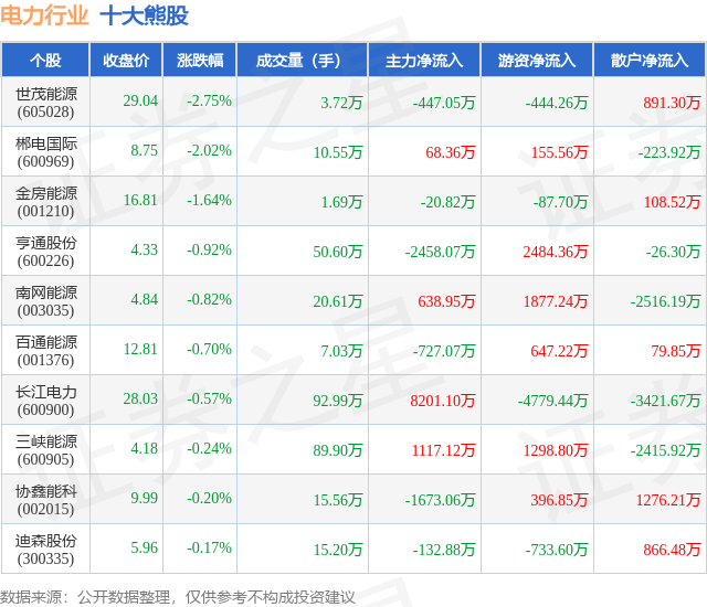 个股表现方面,电力行业当日领跌股为世茂能源(605028),该股当日报收29.04,下跌2.75%,成交量3.72万,主力资金净流出447.05万元。郴电国际(600969)以下跌2.02%紧随其后,该股当日成交量10.55万,主力资金净流入68.36万元。除此之外,金房能源(001210)、亨通股份(600226)、南网能源(003035)均进入当日熊股之列。具体个股列表见下表: