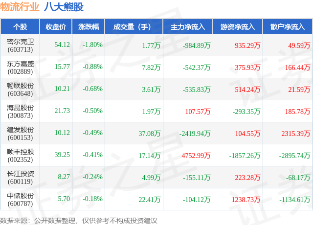 个股表现方面,物流行业当日领跌股为密尔克卫(603713),该股当日报收54.12,下跌1.8%,成交量1.77万,主力资金净流出984.89万元。东方嘉盛(002889)以下跌0.88%紧随其后,该股当日成交量7.82万,主力资金净流出542.37万元。除此之外,畅联股份(603648)、海晨股份(300873)、建发股份(600153)均进入当日熊股之列。具体个股列表见下表: