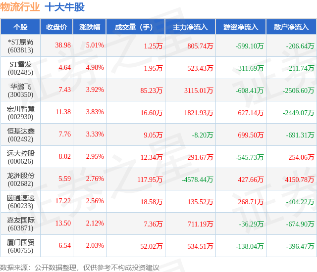 个股表现方面,物流行业当日领涨股为*ST原尚(603813),该股当日报收38.98,上涨5.01%,成交量1.25万,主力资金净流入805.74万元。ST雪发(002485)以上涨4.98%紧随其后,该股当日成交量1.95万,主力资金净流入523.43万元。除此之外,华鹏飞(300350)、宏川智慧(002930)、恒基达鑫(002492)均进入当日牛股之列。具体个股列表见下表: