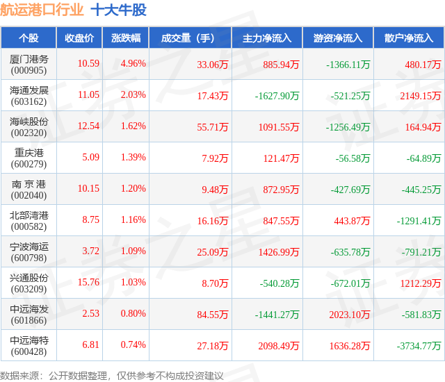 个股表现方面,航运港口行业当日领涨股为厦门港务(000905),该股当日报收10.59,上涨4.96%,成交量33.06万,主力资金净流入885.94万元。海通发展(603162)以上涨2.03%紧随其后,该股当日成交量17.43万,主力资金净流出1627.9万元。除此之外,海峡股份(002320)、重庆港(600279)、南 京 港(002040)均进入当日牛股之列。具体个股列表见下表: