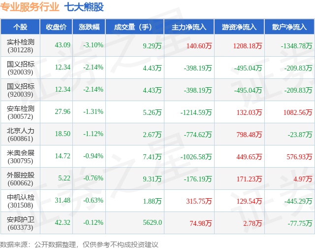 个股表现方面,专业服务行业当日领跌股为实朴检测(301228),该股当日报收43.09,下跌3.1%,成交量9.29万,主力资金净流入140.6万元。国义招标(920039)以下跌2.14%紧随其后,该股当日成交量4.43万,主力资金净流出398.19万元。除此之外,国义招标(920039)、安车检测(300572)、北京人力(600861)均进入当日熊股之列。具体个股列表见下表: