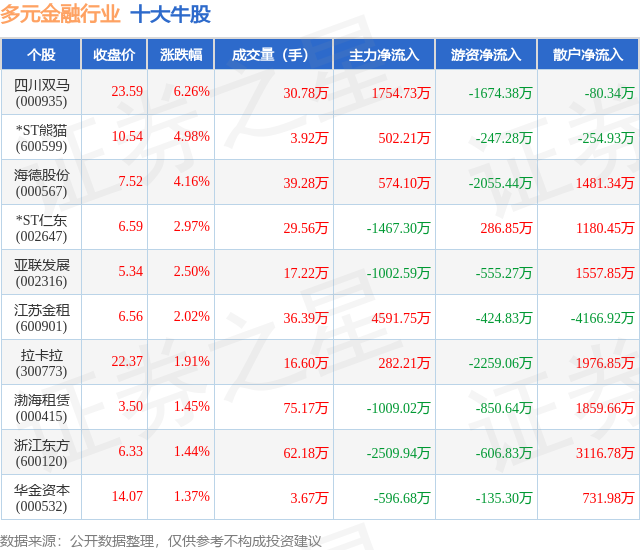 个股表现方面,多元金融行业当日领涨股为四川双马(000935),该股当日报收23.59,上涨6.26%,成交量30.78万,主力资金净流入1754.73万元。*ST熊猫(600599)以上涨4.98%紧随其后,该股当日成交量3.92万,主力资金净流入502.21万元。除此之外,海德股份(000567)、*ST仁东(002647)、亚联发展(002316)均进入当日牛股之列。具体个股列表见下表: