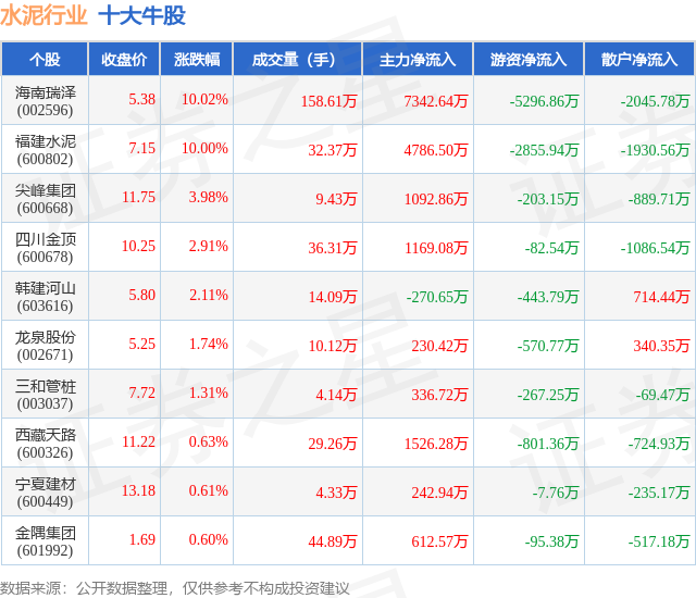 个股表现方面,水泥行业当日领涨股为海南瑞泽(002596),该股当日报收5.38,上涨10.02%,成交量158.61万,主力资金净流入7342.64万元。福建水泥(600802)以上涨10.0%紧随其后,该股当日成交量32.37万,主力资金净流入4786.5万元。除此之外,尖峰集团(600668)、四川金顶(600678)、韩建河山(603616)均进入当日牛股之列。具体个股列表见下表: