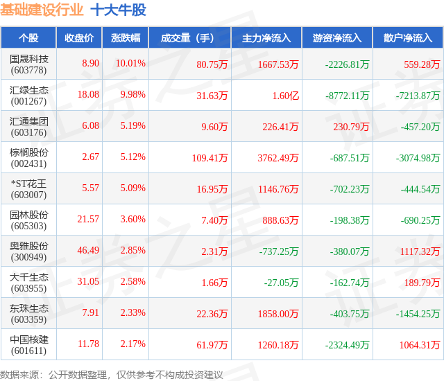 个股表现方面,基础建设行业当日领涨股为国晟科技(603778),该股当日报收8.9,上涨10.01%,成交量80.75万,主力资金净流入1667.53万元。汇绿生态(001267)以上涨9.98%紧随其后,该股当日成交量31.63万,主力资金净流入1.6亿元。除此之外,汇通集团(603176)、棕榈股份(002431)、*ST花王(603007)均进入当日牛股之列。具体个股列表见下表: