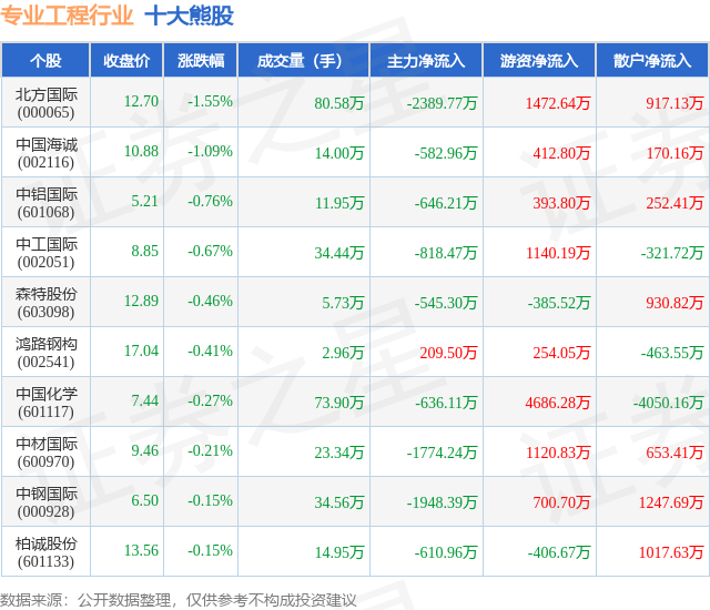 个股表现方面,专业工程行业当日领跌股为北方国际(000065),该股当日报收12.7,下跌1.55%,成交量80.58万,主力资金净流出2389.77万元。中国海诚(002116)以下跌1.09%紧随其后,该股当日成交量14.0万,主力资金净流出582.96万元。除此之外,中铝国际(601068)、中工国际(002051)、森特股份(603098)均进入当日熊股之列。具体个股列表见下表: