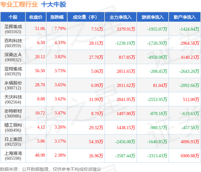 个股表现方面,专业工程行业当日领涨股为圣晖集成(603163),该股当日报收51.06,上涨7.79%,成交量7.51万,主力资金净流入3379.91万元。百利科技(603959)以上涨4.33%紧随其后,该股当日成交量28.11万,主力资金净流出1238.19万元。除此之外,深桑达A(000032)、亚翔集成(603929)、永福股份(300712)均进入当日牛股之列。具体个股列表见下表: