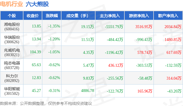 个股表现方面,电机行业当日领跌股为湘电股份(600416),该股当日报收13.85,下跌1.35%,成交量19.15万,主力资金净流出5551.79万元。华瑞股份(300626)以下跌1.2%紧随其后,该股当日成交量11.51万,主力资金净流出484.42万元。除此之外,兆威机电(003021)、鸣志电器(603728)、科力尔(002892)均进入当日熊股之列。具体个股列表见下表: