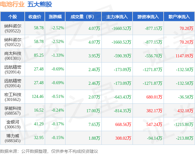 个股表现方面,电池行业当日领跌股为纳科诺尔(920522),该股当日报收58.78,下跌2.52%,成交量4.07万,主力资金净流出1660.52万元。纳科诺尔(920522)以下跌2.52%紧随其后,该股当日成交量4.07万,主力资金净流出1660.52万元。除此之外,尚太科技(001301)、远航精密(920914)、远航精密(920914)均进入当日熊股之列。具体个股列表见下表: