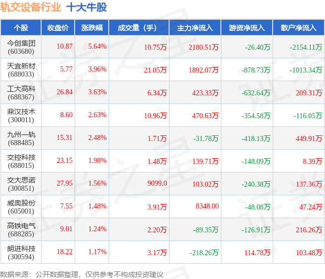 个股表现方面,轨交设备行业当日领涨股为今创集团(603680),该股当日报收10.87,上涨5.64%,成交量10.75万,主力资金净流入2180.51万元。天宜新材(688033)以上涨3.96%紧随其后,该股当日成交量21.05万,主力资金净流入1892.07万元。除此之外,工大高科(688367)、鼎汉技术(300011)、九州一轨(688485)均进入当日牛股之列。具体个股列表见下表: