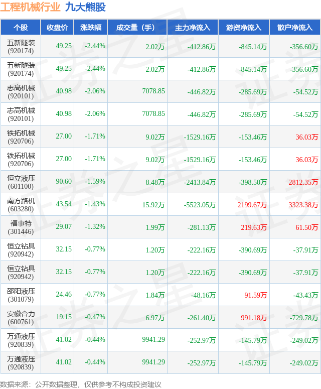 个股表现方面,工程机械行业当日领跌股为五新隧装(920174),该股当日报收49.25,下跌2.44%,成交量2.02万,主力资金净流出412.86万元。五新隧装(920174)以下跌2.44%紧随其后,该股当日成交量2.02万,主力资金净流出412.86万元。除此之外,志高机械(920101)、志高机械(920101)、铁拓机械(920706)均进入当日熊股之列。具体个股列表见下表: