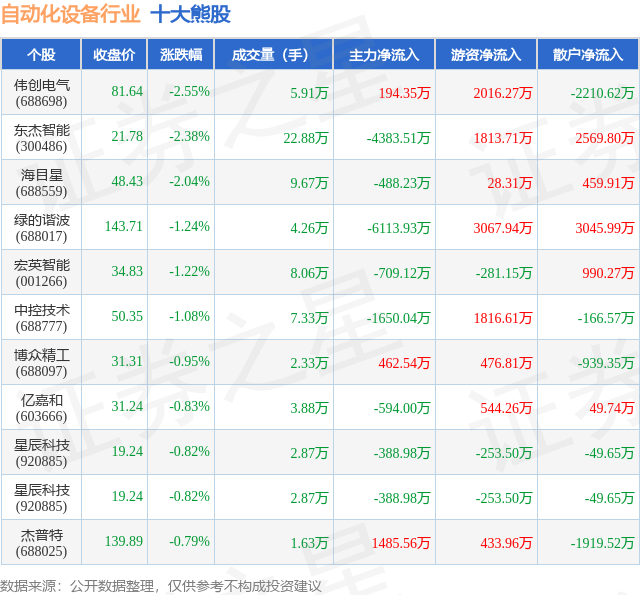 个股表现方面,自动化设备行业当日领跌股为伟创电气(688698),该股当日报收81.64,下跌2.55%,成交量5.91万,主力资金净流入194.35万元。东杰智能(300486)以下跌2.38%紧随其后,该股当日成交量22.88万,主力资金净流出4383.51万元。除此之外,海目星(688559)、绿的谐波(688017)、宏英智能(001266)均进入当日熊股之列。具体个股列表见下表: