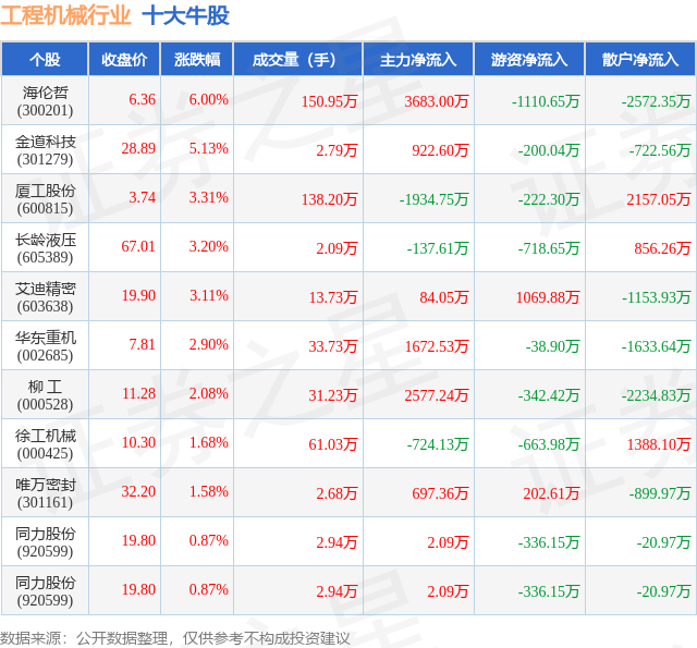 个股表现方面,工程机械行业当日领涨股为海伦哲(300201),该股当日报收6.36,上涨6.0%,成交量150.95万,主力资金净流入3683.0万元。金道科技(301279)以上涨5.13%紧随其后,该股当日成交量2.79万,主力资金净流入922.6万元。除此之外,厦工股份(600815)、长龄液压(605389)、艾迪精密(603638)均进入当日牛股之列。具体个股列表见下表: