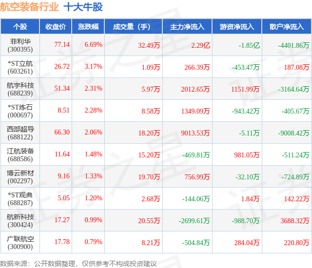 个股表现方面,航空装备行业当日领涨股为菲利华(300395),该股当日报收77.14,上涨6.69%,成交量32.49万,主力资金净流入2.29亿元。*ST立航(603261)以上涨3.17%紧随其后,该股当日成交量1.09万,主力资金净流入266.39万元。除此之外,航宇科技(688239)、*ST炼石(000697)、西部超导(688122)均进入当日牛股之列。具体个股列表见下表: