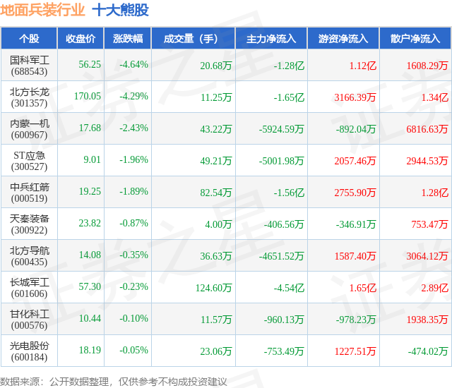 个股表现方面,地面兵装行业当日领跌股为国科军工(688543),该股当日报收56.25,下跌4.64%,成交量20.68万,主力资金净流出1.28亿元。北方长龙(301357)以下跌4.29%紧随其后,该股当日成交量11.25万,主力资金净流出1.65亿元。除此之外,内蒙一机(600967)、ST应急(300527)、中兵红箭(000519)均进入当日熊股之列。具体个股列表见下表: