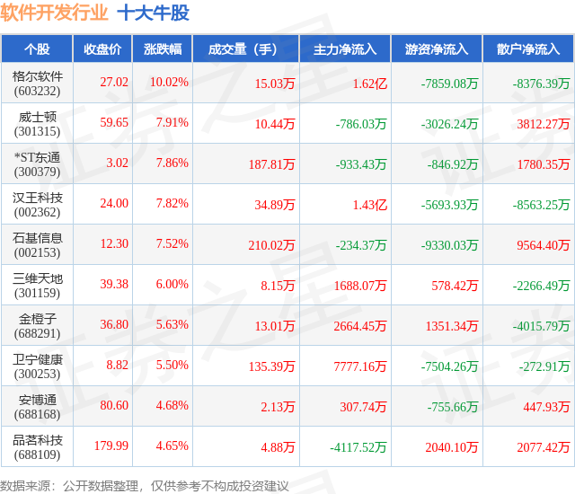 个股表现方面,软件开发行业当日领涨股为格尔软件(603232),该股当日报收27.02,上涨10.02%,成交量15.03万,主力资金净流入1.62亿元。威士顿(301315)以上涨7.91%紧随其后,该股当日成交量10.44万,主力资金净流出786.03万元。除此之外,*ST东通(300379)、汉王科技(002362)、石基信息(002153)均进入当日牛股之列。具体个股列表见下表: