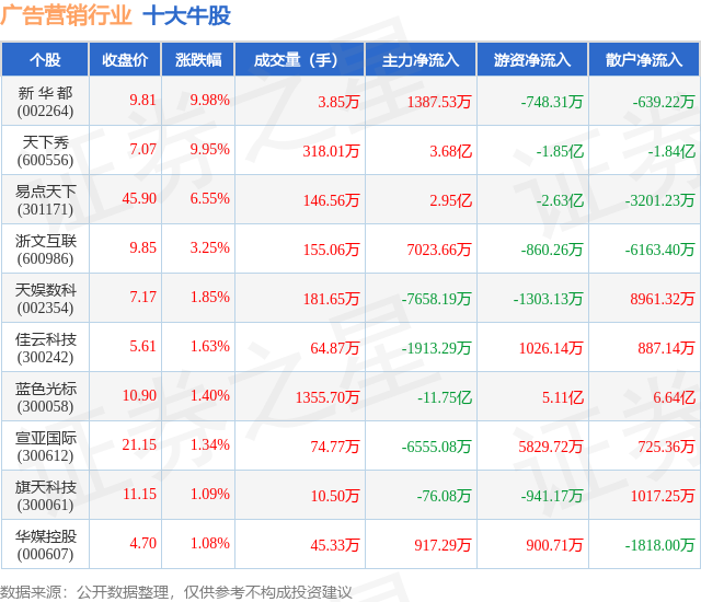 个股表现方面,广告营销行业当日领涨股为新 华 都(002264),该股当日报收9.81,上涨9.98%,成交量3.85万,主力资金净流入1387.53万元。天下秀(600556)以上涨9.95%紧随其后,该股当日成交量318.01万,主力资金净流入3.68亿元。除此之外,易点天下(301171)、浙文互联(600986)、天娱数科(002354)均进入当日牛股之列。具体个股列表见下表: