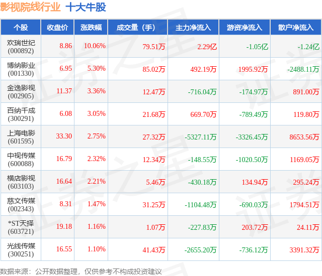 个股表现方面,影视院线行业当日领涨股为欢瑞世纪(000892),该股当日报收8.86,上涨10.06%,成交量79.51万,主力资金净流入2.29亿元。博纳影业(001330)以上涨5.3%紧随其后,该股当日成交量85.02万,主力资金净流入492.19万元。除此之外,金逸影视(002905)、百纳千成(300291)、上海电影(601595)均进入当日牛股之列。具体个股列表见下表: