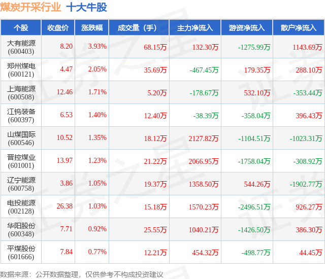 个股表现方面,煤炭开采行业当日领涨股为大有能源(600403),该股当日报收8.2,上涨3.93%,成交量68.15万,主力资金净流入132.3万元。郑州煤电(600121)以上涨2.05%紧随其后,该股当日成交量35.69万,主力资金净流出467.45万元。除此之外,上海能源(600508)、江钨装备(600397)、山煤国际(600546)均进入当日牛股之列。具体个股列表见下表: