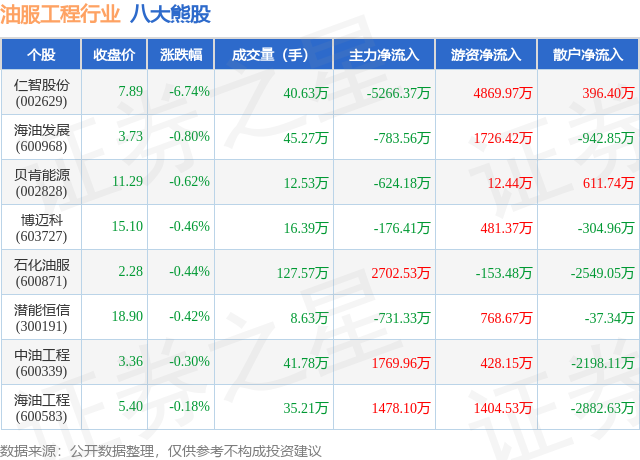个股表现方面,油服工程行业当日领跌股为仁智股份(002629),该股当日报收7.89,下跌6.74%,成交量40.63万,主力资金净流出5266.37万元。海油发展(600968)以下跌0.8%紧随其后,该股当日成交量45.27万,主力资金净流出783.56万元。除此之外,贝肯能源(002828)、博迈科(603727)、石化油服(600871)均进入当日熊股之列。具体个股列表见下表: