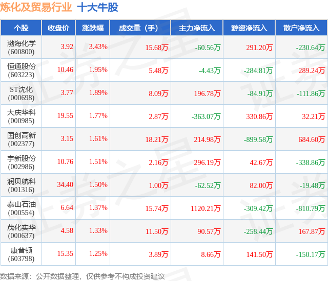 个股表现方面,炼化及贸易行业当日领涨股为渤海化学(600800),该股当日报收3.92,上涨3.43%,成交量15.68万,主力资金净流出60.56万元。恒通股份(603223)以上涨1.95%紧随其后,该股当日成交量5.48万,主力资金净流出4.43万元。除此之外,ST沈化(000698)、大庆华科(000985)、国创高新(002377)均进入当日牛股之列。具体个股列表见下表: