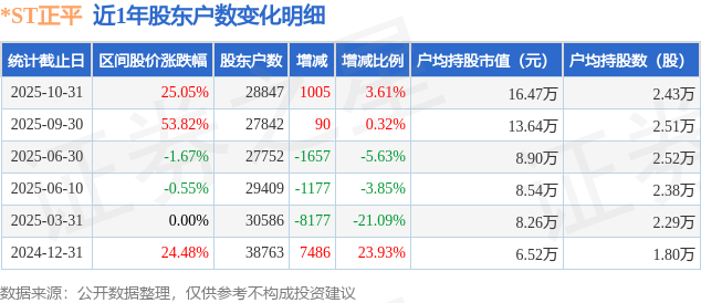 从股价来看,2025年9月30日至2025年10月31日,*ST正平区间涨幅为25.05%,在此期间股东户数增加1005.0户,增幅为3.61%。
