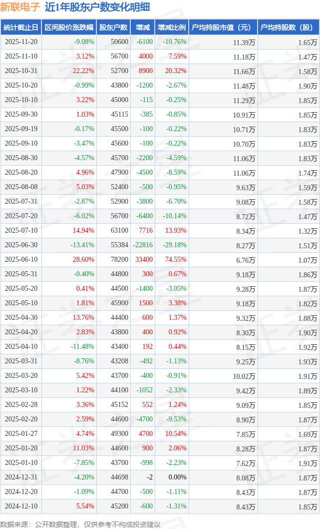 从股价来看,2025年11月10日至2025年11月20日,新联电子区间跌幅为9.08%,在此期间股东户数减少6100.0户,减幅为10.76%。