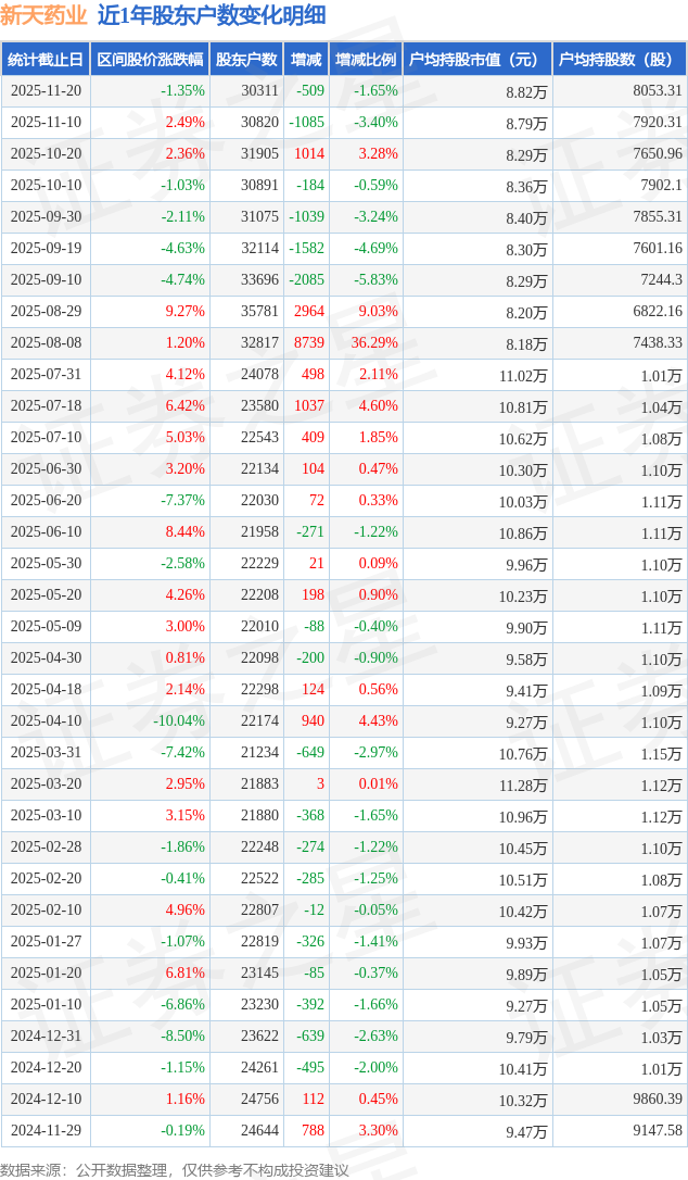 从股价来看,2025年11月10日至2025年11月20日,新天药业区间跌幅为1.35%,在此期间股东户数减少509.0户,减幅为1.65%。