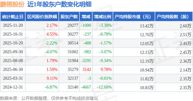 从股价来看,2025年10月31日至2025年11月20日,鹏翎股份区间涨幅为2.17%,在此期间股东户数减少1000.0户,减幅为3.3%。