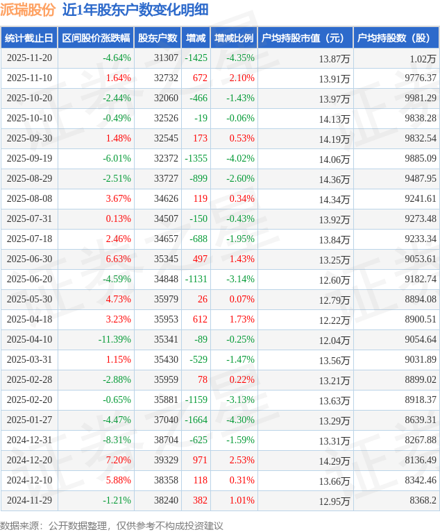 从股价来看,2025年11月10日至2025年11月20日,派瑞股份区间跌幅为4.64%,在此期间股东户数减少1425.0户,减幅为4.35%。