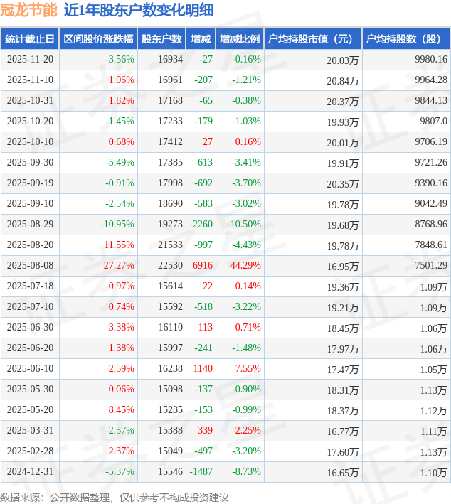 从股价来看,2025年11月10日至2025年11月20日,冠龙节能区间跌幅为3.56%,在此期间股东户数减少27.0户,减幅为0.16%。