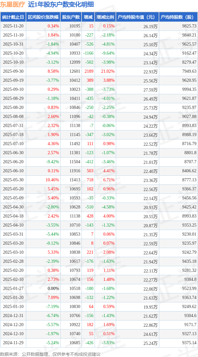 从股价来看,2025年11月10日至2025年11月20日,东星医疗区间涨幅为0.34%,在此期间股东户数增加15.0户,增幅为0.15%。