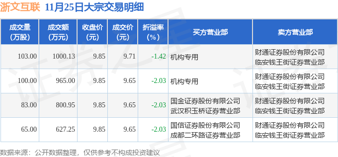 证券之星消息,11月25日浙文互联发生大宗交易,交易数据如下: