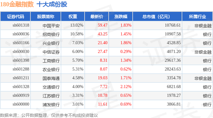 证券之星消息,11月25日,180金融(000018)指数报收于5833.16点,涨1.3%,成交408.98亿元,换手率0.29%。当日该指数成份股中,上涨的有32家,首创证券以3.91%的涨幅领涨,下跌的有6家,方正证券以0.51%的跌幅领跌。