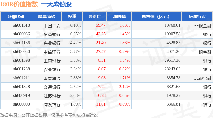 证券之星消息,11月25日,180R价值(000031)指数报收于3224.46点,涨0.95%,成交1367.0亿元,换手率0.37%。当日该指数成份股中,上涨的有85家,兆易创新以6.38%的涨幅领涨,下跌的有35家,中国国航以3.01%的跌幅领跌。