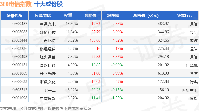 证券之星消息,11月25日,380电信(000112)指数报收于5491.75点,涨2.79%,成交118.7亿元,换手率2.01%。当日该指数成份股中,上涨的有18家,长飞光纤以9.99%的涨幅领涨,下跌的有3家,中南传媒以1.55%的跌幅领跌。