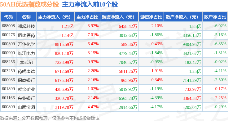 资金流向方面,50AH优选(000170)指数成份股当日主力资金净流出合计4.68亿元,游资资金净流入合计7.16亿元,散户资金净流出合计2.48亿元。成份股资金流向详情见下表:
