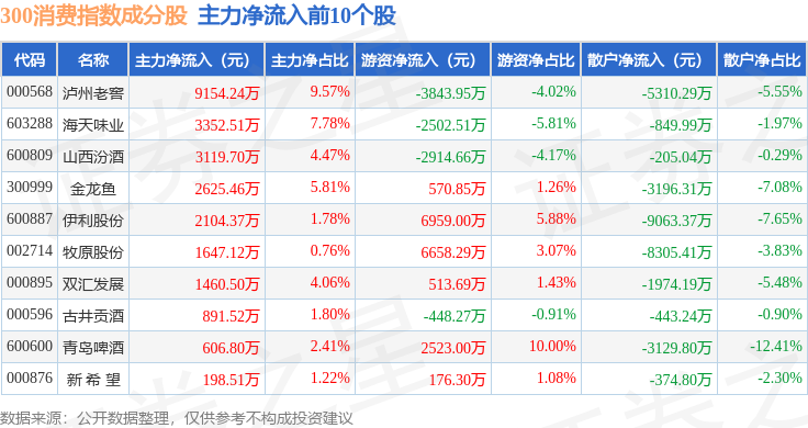 资金流向方面,300消费(000912)指数成份股当日主力资金净流出合计3.76亿元,游资资金净流入合计4.36亿元,散户资金净流出合计5981.75万元。成份股资金流向详情见下表: