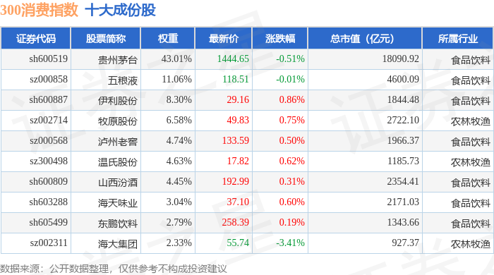 证券之星消息,11月25日,300消费(000912)指数报收于21885.08点,跌0.12%,成交157.21亿元,换手率0.56%。当日该指数成份股中,上涨的有10家,伊利股份以0.86%的涨幅领涨,下跌的有7家,海大集团以3.41%的跌幅领跌。