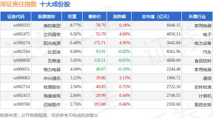 深证责任(399341)指数十大成份股详情如下: