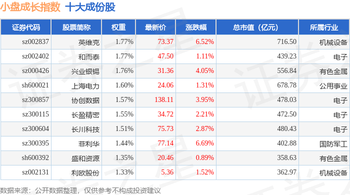 证券之星消息,11月25日,小盘成长(399376)指数报收于5878.47点,涨1.54%,成交1058.07亿元,换手率2.42%。当日该指数成份股中,上涨的有129家,菲利华以6.69%的涨幅领涨,下跌的有36家,派林生物以1.69%的跌幅领跌。