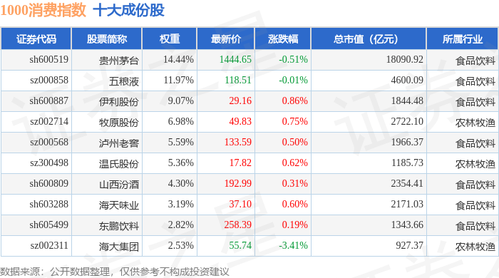 证券之星消息,11月25日,1000消费(399385)指数报收于9727.51点,涨0.18%,成交237.73亿元,换手率0.84%。当日该指数成份股中,上涨的有31家,安琪酵母以2.87%的涨幅领涨,下跌的有24家,海大集团以3.41%的跌幅领跌。