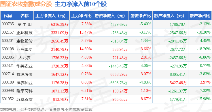 资金流向方面,国证农牧(399435)指数成份股当日主力资金净流出合计3.95亿元,游资资金净流入合计2.69亿元,散户资金净流入合计1.26亿元。成份股资金流向详情见下表: