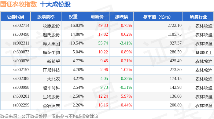 证券之星消息,11月25日,国证农牧(399435)指数报收于4016.98点,跌0.04%,成交148.45亿元,换手率2.7%。当日该指数成份股中,上涨的有19家,生物股份以5.97%的涨幅领涨,下跌的有19家,国联水产以10.51%的跌幅领跌。