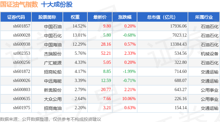 证券之星消息,11月25日,国证油气(399439)指数报收于1832.37点,涨0.42%,成交143.24亿元,换手率0.53%。当日该指数成份股中,上涨的有35家,大众公用以10.06%的涨幅领涨,下跌的有14家,兰石重装以4.28%的跌幅领跌。