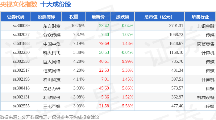 央视文化(399557)指数十大成份股详情如下: