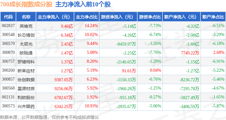 资金流向方面,700成长(399628)指数成份股当日主力资金净流入合计16.82亿元,游资资金净流出合计1.31亿元,散户资金净流出合计15.51亿元。成份股资金流向详情见下表: